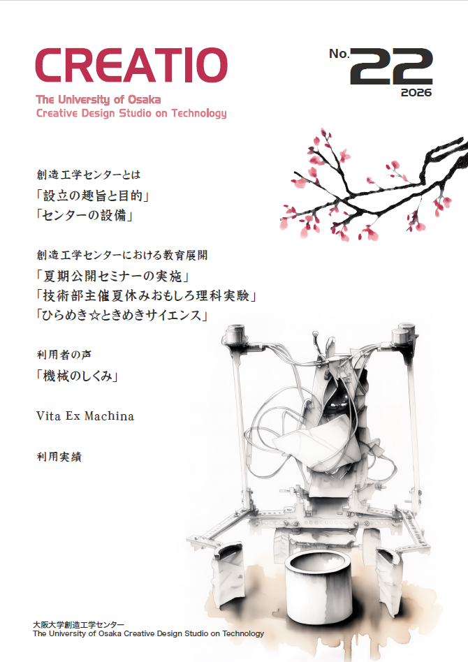 広報誌 Creatio 創造工学センター誌 Creatio最新号 【創造工学センターとは】「設立の趣旨と目的」「センターの設備」 【創造工学センターにおける教育展開】「夏期公開セミナーの実施」「技術部主催夏休みおもしろ理科実験」「ひらめき☆ときめきサイエンス」 【利用者の声】「機械のしくみ」 【Vita Ex Machina】 Creatio No.22(2026年発行) バックナンバー CREATIO March.2005 CREATIO No.2 March.2006 CREATIO No.3 March.2007 CREATIO No.4 March.2008 CREATIO No.5 March.2009 CREATIO No.6 January.2010 CREATIO No.7 January.2011 CREATIO No.8 January.2012 CREATIO No.9 January.2013 CREATIO No.10 January.2014 CREATIO No.11 January.2015 CREATIO No.12 January.2016 CREATIO No.13 April.2017 CREATIO No.14 April.2018 CREATIO No.15 April.2019 CREATIO No.16 2020 CREATIO No.17 2021 CREATIO No.18 2022 CREATIO No.19 2023 CREATIO No.20 2024 CREATIO No.21 2025